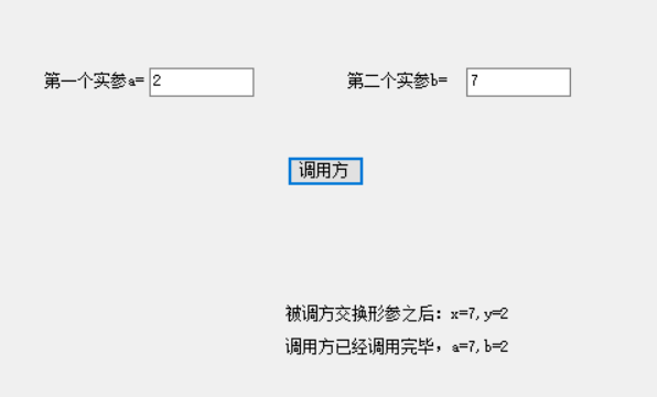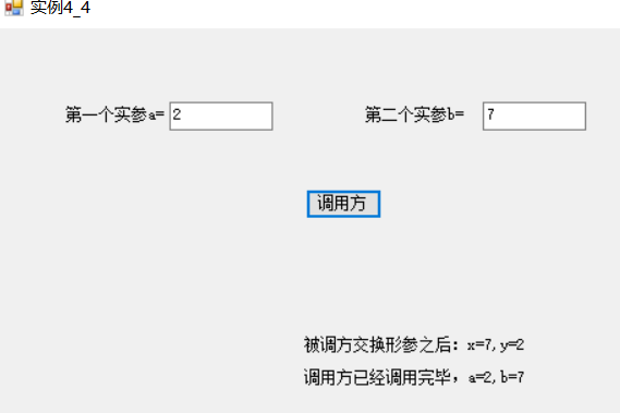 using System; using System.Collections.Generic; using System.ComponentModel; using System.Data; using System.Drawing; using System.Linq; using System.Text; using System.Threading.Tasks; using System.Windows.Forms; namespace 第4章 { public partial class 实例4_4 : Form { public 实例4_4() { InitializeComponent(); } private void button1_Click(object sender, EventArgs e) //调用方 { Swaper x = new Swaper(); //创建对象 int a = Convert.ToInt32(textBox1.Text); int b = Convert.ToInt32(textBox2.Text); lblShow.Text = x.Swap(a, b); //调用并传递参数,a和b是实参变量 lblShow.Text += string.Format("\n\n调用方已经调用完毕,a={0},b={1}", a, b); } } class Swaper { public string Swap(int x,int y) //被调方,其中x和y是形参 { int temp = x; x = y; y = temp; return string.Format("被调方交换形参之后:x={0},y={1}", x, y); } } }