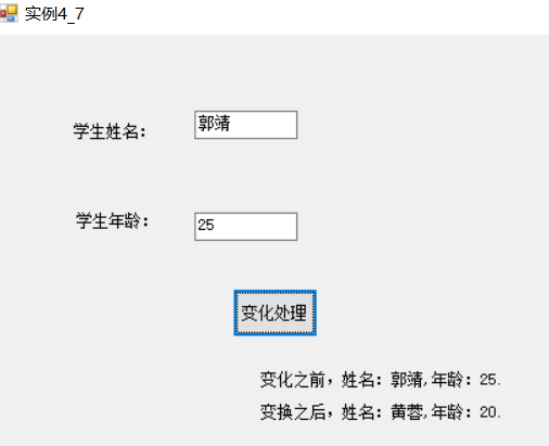 using System; using System.Collections.Generic; using System.ComponentModel; using System.Data; using System.Drawing; using System.Linq; using System.Text; using System.Threading.Tasks; using System.Windows.Forms; namespace 第4章 { public partial class 实例4_7 : Form { public 实例4_7() { InitializeComponent(); } void change(Student one) //被调方,one为引用类型的形参变量 { one.name = "黄蓉"; one.age = 20; } private void button1_Click(object sender, EventArgs e) { string name = textBox1.Text; int age = int.Parse(textBox2.Text); Student x = new Student(name, age); //创建对象x lblShow.Text = "变化之前," + x.getInfo(); //输出对象x的信息 change(x); //调用语句,x为引用类型的实参变量 lblShow.Text += "变换之后," + x.getInfo(); //重新输出对象x的信息 } } class Student { public string name; //字段成员 public int age; //字段成员 public Student(string name,int age) //构造函数 { this.name = name; this.age = age; } public string getInfo() //方法成员 { return string.Format("姓名:{0},年龄:{1}.\n\n", name, age); } } }