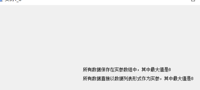 using System; using System.Collections.Generic; using System.ComponentModel; using System.Data; using System.Drawing; using System.Linq; using System.Text; using System.Threading.Tasks; using System.Windows.Forms; namespace 第4章 { public partial class 实例4_8 : Form { public 实例4_8() { InitializeComponent(); } int Max(int[] a) //形参不是params数组 { int k = 0; //k用来记录最大数的下标值 for(int i=0;i<a.Length;i++) { if (a[k] < a[i]) k = i; } return a[k]; } int Max2(params int[] a) //形参是params数组,实参可使用数据列表 { int k = 0; for(int i=0;i<a.Length;i++) { if (a[k] < a[i]) k = i; } return a[k]; } private void 实例4_8_Load(object sender, EventArgs e) { int[] x = new int[] { 4,7,1,3,2,8,6,5}; int n = Max(x); //调用方法,将实参数组x传递给形参数组 lblShow.Text = "所有数据保存在实参数组中,其中最大值是" + n; n = Max2(4, 7, 1, 3, 2, 8, 6, 5); //调用方法,把数据列表作为实参传递给形参数组 lblShow.Text += "\n\n所有数据直接以数据列表形式作为实参,其中最大值是" + n; } } }