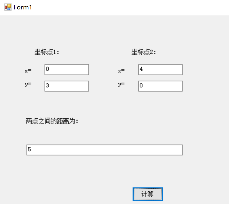 using System; using System.Collections.Generic; using System.ComponentModel; using System.Data; using System.Drawing; using System.Linq; using System.Text; using System.Threading.Tasks; using System.Windows.Forms; namespace 练习 { public partial class 计算两点之间距离 : Form { public 计算两点之间距离() { InitializeComponent(); } private void button1_Click(object sender, EventArgs e) { int x1, y1, x2, y2; x1 = Convert.ToInt32(textBox1.Text); y1 = Convert.ToInt32(textBox2.Text); x2 = Convert.ToInt32(textBox3.Text); y2 = Convert.ToInt32(textBox4.Text); Point p1 = new Point(x1, y1); Point p2 = new Point(x2, y2); textBox5.Text = p1.Distance(p2).ToString(); } class Point { private int x; private int y; public int X { get { return x; } } public int Y { get { return y; } } public double Distance(Point p) { return System.Math.Sqrt((this.X - p.X) * (this.X - p.X) + (this.Y - p.Y) * (this.Y - p.Y)); } public Point(int a,int b) { x = a; y = b; } } } }