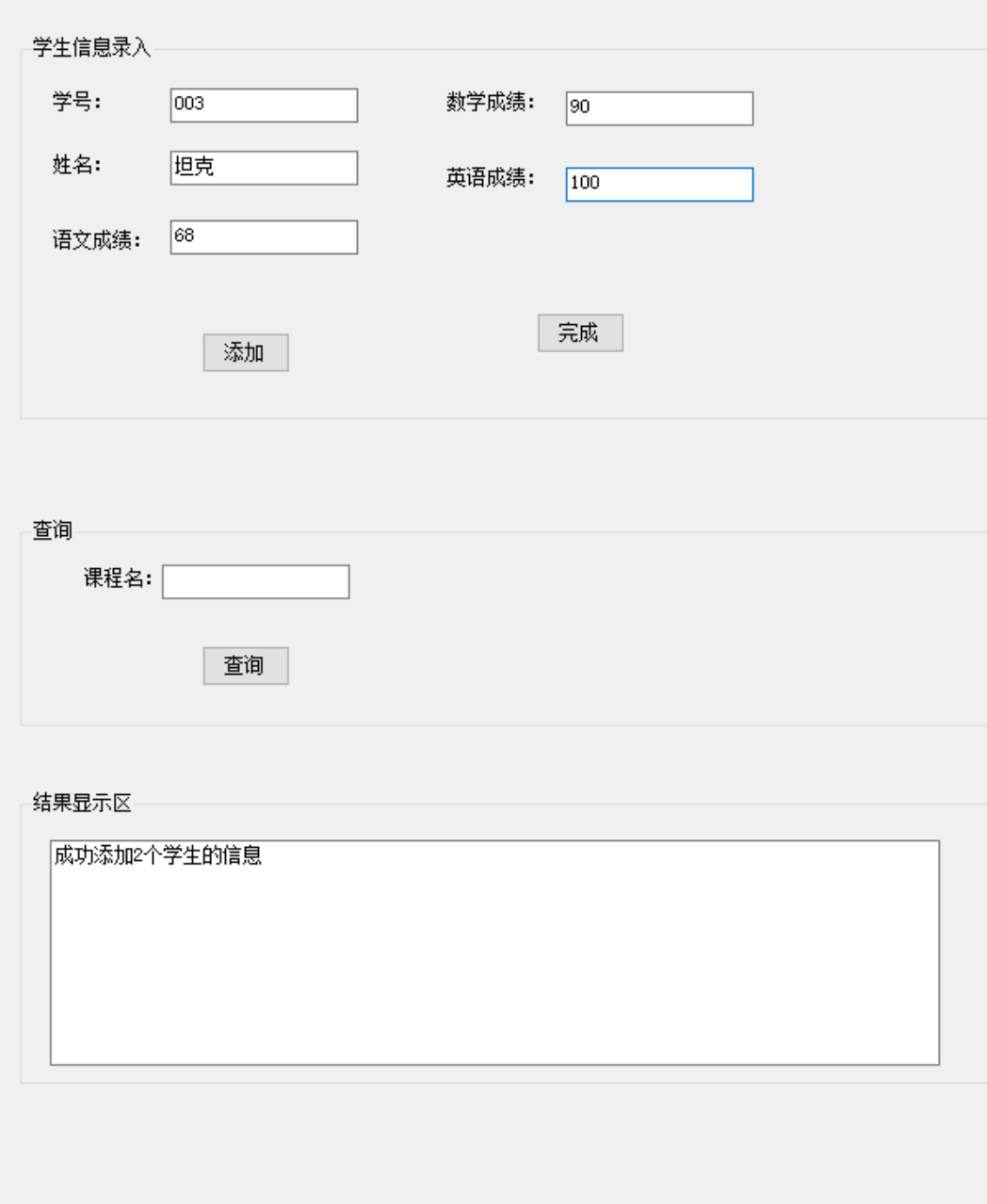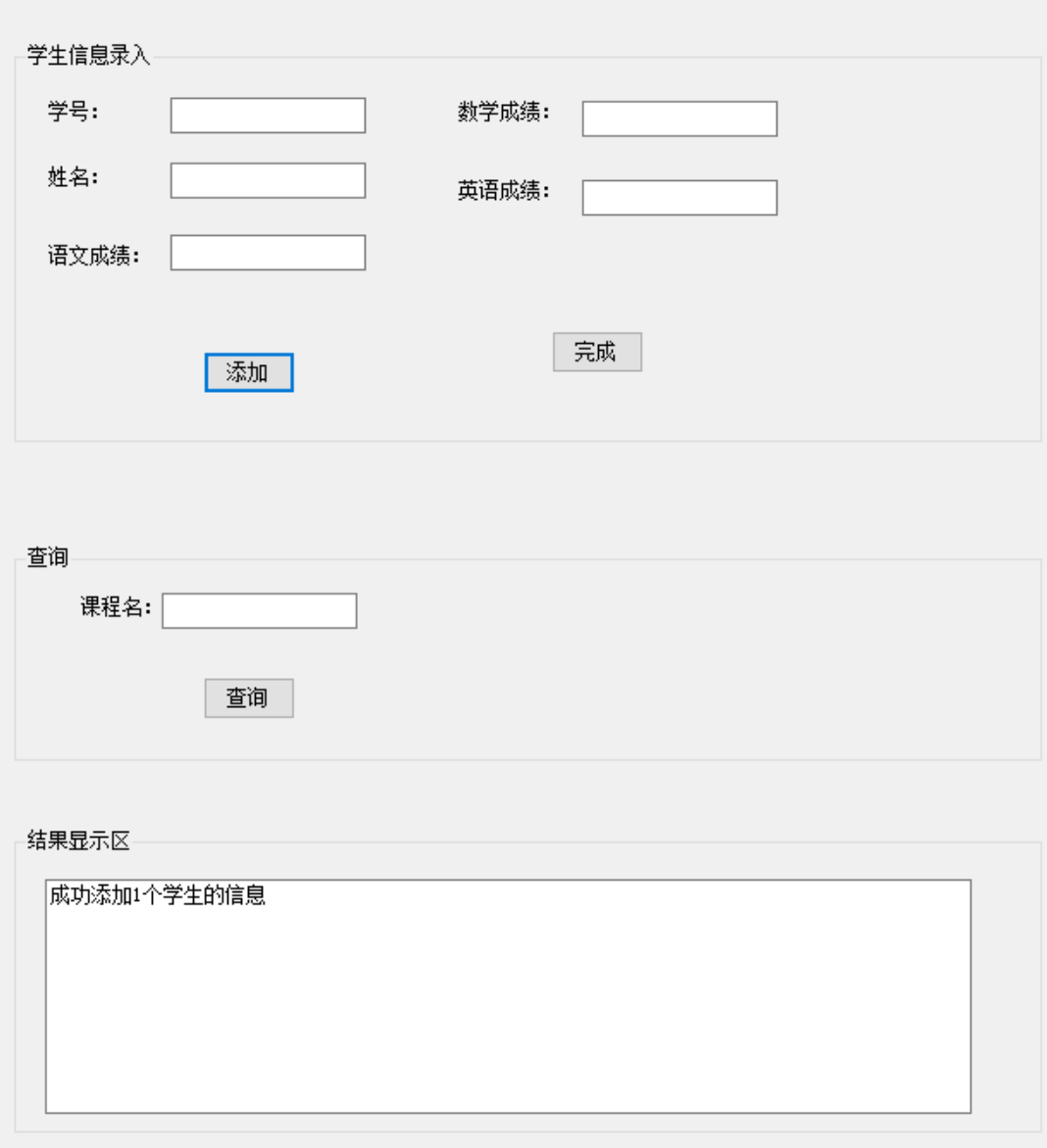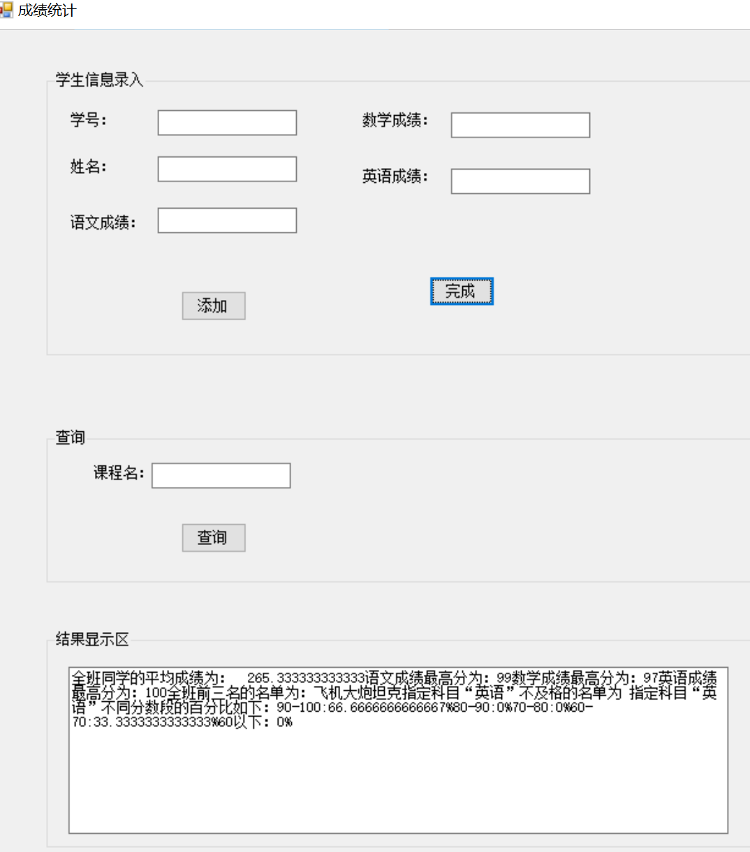 using System; using System.Collections.Generic; using System.ComponentModel; using System.Data; using System.Drawing; using System.Linq; using System.Text; using System.Threading.Tasks; using System.Windows.Forms; namespace 练习 { public partial class 成绩统计 : Form { public 成绩统计() { InitializeComponent(); } Student[] st = new Student[100]; Grade gr = new Grade(); int i = 0; public class Student { public string sno; public string name; public double chinese; public double math; public double english; public Student(string sno,string name,double chinese,double math,double english) { this.sno = sno; this.name = name; this.chinese = chinese; this.math = math; this.english = english; } public double Sum { get { return chinese + math + english; } } } public class Grade { Student[] stu = new Student[100]; //存放班级中的每个同学的信息 double[] sum2 = new double[100]; //存放每个同学的总成绩 int i = 0; //学生人数 public Grade() { } public void Add(Student s) { stu[i] = s; //添加每个学生到班级中 sum2[i] = stu[i].Sum; //保存每个学生的总成绩 i++; //学生人数加1 } //查询指定学生的总成绩 int x = 0; int k = 0; bool flag = false; public double getSum(string s) { for(x=0;x<i;x++) { if(stu[x].name==s) { k = x; flag = true; } } if (flag==true) { return sum2[k]; //如果该学生在班级中,则返回该学生的总成绩,否则,返回-1 } else { return -1; } } //统计全班同学的平均成绩(2) double avg = 0; public double getAverage() { for(int aa=0;aa<i;aa++) { avg += sum2[aa]; } return avg / i; } //统计语文成绩最高分(3-1) double maxChinese = 0; public double getChineseMax() { for(int z=0;z<i;z++) { if(stu[z].chinese >maxChinese) { maxChinese = stu[z].chinese; } } return maxChinese; } //统计数学成绩最高分(3-2) double maxMath = 0; public double getMathMax() { for(int z = 0; z < i; z++) { if (stu[z].math > maxMath) { maxMath = stu[z].math; } } return maxMath; } //统计英语成绩最高分(3-3) double maxEnglish = 0; public double getEnglishMax() { for(int z = 0; z < i; z++) { if(stu[z].english>maxEnglish) { maxEnglish = stu[z].english; } } return maxEnglish; } //可以统计全班前3名的名单(4)--根据总成绩数组sum2[]将所有学生即stu数组重新排序 public string getNames() { Student[] t = new Student[1]; //中间变量(通过Student类型的中间变量,根据每个学生的总成绩重新排列学生类的全部信息) t[0] = new Student("", "", 0, 0, 0); double t2 = 0; for(int xx = 0; xx < i - 1; xx++) { for(int yy=xx+1;yy<i;yy++) { if(sum2[yy]>sum2[xx]) { t2 = sum2[yy]; sum2[yy] = sum2[xx]; sum2[xx] = t2; t[0] = stu[yy]; stu[yy] = stu[xx]; stu[xx] = t[0]; } } } return "" + stu[0].name + "" + stu[1].name + "" + stu[2].name; } //可以指定课程不及格的学生名单 string md = ""; public string getStudentMenu(string s) { if(s=="语文") { for(int x=0;x<i;x++) { if(stu[x].chinese<60) { md += " " + stu[x].name; } } return " " + md; } else if(s=="数学") { for(int x=0;x<i;x++) { if(stu[x].math<60) { md += " " + stu[x].name; } } return " " + md; } else if (s == "英语") { for(int x =0;x<i;x++) { if(stu[x].english<60) { md += " " + stu[x].name; } } return " " + md; } else { return "不存在(您输入的课程名称不正确)"; } } //统计指定课程在不同分数段的学生人数百分比 public string getStudentBFB(string s) { if (s == "语文") { double yw1 = 0; double yw2 = 0; double yw3 = 0; double yw4 = 0; double yw5 = 0; for(int z=0;z<i;z++) { if(stu[z].chinese<=100&&stu[z].chinese>=90) { yw1++; } else if (stu[z].chinese < 90 && stu[z].chinese >= 80) { yw2++; } else if (stu[z].chinese < 80 && stu[z].chinese >= 70) { yw3++; } else if (stu[z].chinese < 70 && stu[z].chinese >= 60) { yw4++; } else { yw5++; } } return "\n90-100:" + (yw1 / i) * 100.0 + "%\n80-90:" + (yw2 / i) * 100.0 + "%\n70-80:" + (yw3 / i) * 100.0 + "%\n60-70:" + (yw4 / i) * 100.0 + "%\n60以下:" + (yw5 / i) * 100.0 + "%"; } else if (s == "数学") { double yw1 = 0; double yw2 = 0; double yw3 = 0; double yw4 = 0; double yw5 = 0; for(int z=0;z<i;z++) { if (stu[z].math <= 100 && stu[z].math >= 90) { yw1++; } else if (stu[z].math < 90 && stu[z].math >= 80) { yw2++; } else if (stu[z].math < 80 && stu[z].math >= 70) { yw3++; } else if (stu[z].math < 70 && stu[z].math >= 60) { yw4++; } else { yw5++; } } return "\n90-100:" + (yw1 / i) * 100.0 + "%\n80-90:" + (yw2 / i) * 100.0 + "%\n70-80:" + (yw3 / i) * 100.0 + "%\n60-70:" + (yw4 / i) * 100.0 + "%\n60以下:" + (yw5 / i) * 100.0 + "%"; } else if (s == "英语") { double yw1 = 0; double yw2 = 0; double yw3 = 0; double yw4 = 0; double yw5 = 0; for (int z = 0; z < i; z++) { if (stu[z].english <= 100 && stu[z].english >= 90) { yw1++; } else if (stu[z].english < 90 && stu[z].english >= 80) { yw2++; } else if (stu[z].english < 80 && stu[z].english >= 70) { yw3++; } else if (stu[z].english < 70 && stu[z].english >= 60) { yw4++; } else { yw5++; } } return "\n90-100:" + (yw1 / i) * 100.0 + "%\n80-90:" + (yw2 / i) * 100.0 + "%\n70-80:" + (yw3 / i) * 100.0 + "%\n60-70:" + (yw4 / i) * 100.0 + "%\n60以下:" + (yw5 / i) * 100.0 + "%"; } else { return "不存在(您输入的课程名称不正确)"; } } } //添加每个学生成绩 private void button1_Click(object sender, EventArgs e) { try { st[i] = new Student(textBox2.Text, textBox3.Text, Convert.ToInt32(textBox4.Text), Convert.ToInt32(textBox5.Text), Convert.ToInt32(textBox6.Text)); gr.Add(st[i]); i++; textBox1.Text = "成功添加" + i + "个学生的信息"; textBox2.Text = ""; textBox3.Text = ""; textBox4.Text = ""; textBox5.Text = ""; textBox6.Text = ""; } catch { MessageBox.Show("输入完善的学生信息进行添加!!!"); } } //点击完成按钮显示各种查询结果 private void button2_Click(object sender, EventArgs e) { textBox1.Text = ""; if (textBox8.Text.Trim() != "") { //计算全班学生的平均成绩 textBox1.Text += "\n\n全班同学的平均成绩为: " + Convert.ToString(gr.getAverage()); //统计单