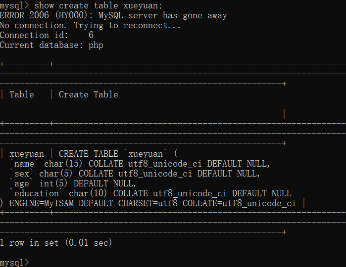 create table xueyuan(name char(15),sex char(5),age int(5),education(10),)