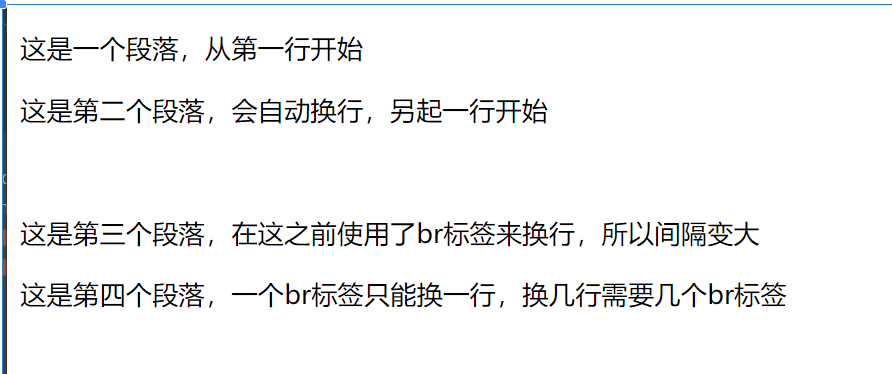 <p>这是第三个段落,在这之前使用了br标签来换行,所以间隔变大</p>
