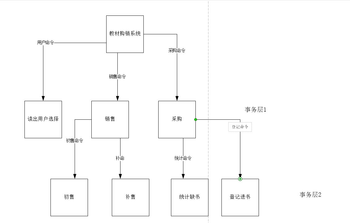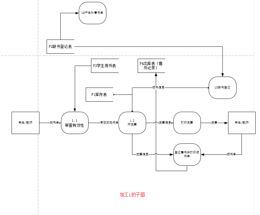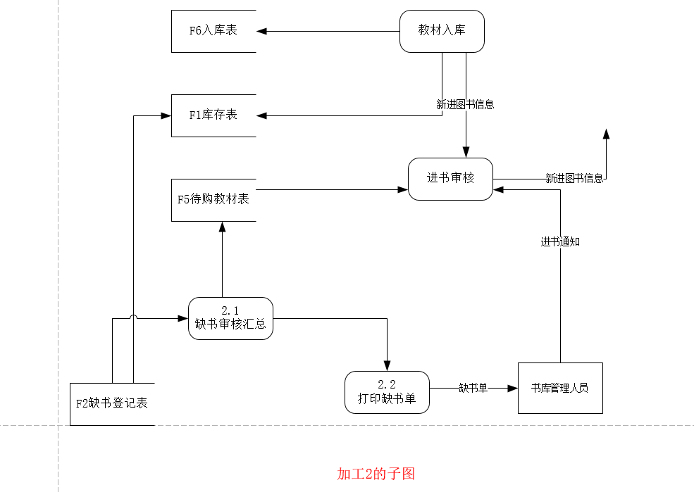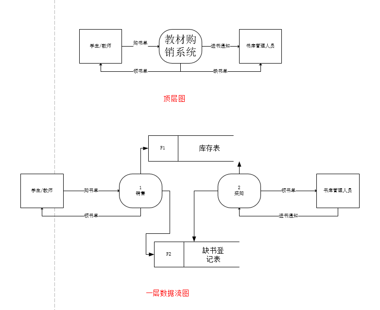 采购系统的主要工作过程为:若是脱销教材,则登记缺书,发缺书单给书库采购人员;一旦新书入库后,即发进书单通知给教材发