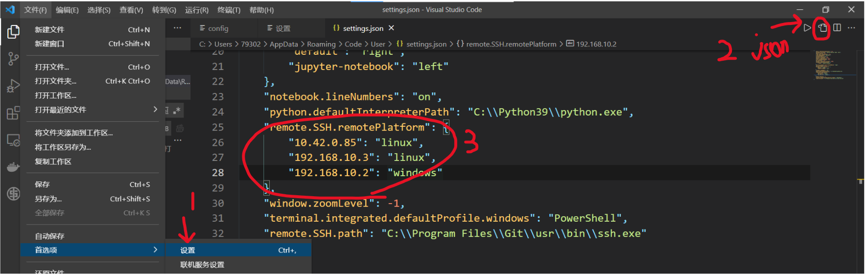 由于之前 ssh 连接的电脑没有设置静态 IP,导致连接时选择的系统不匹配(有些是 windows,有些是 linux),可以在设置的 json 文件里修改。