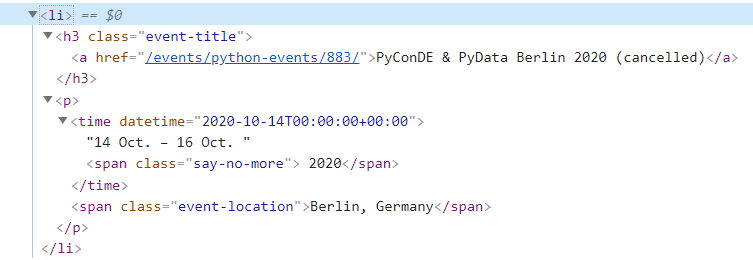 对网页https://www.python.org/events/python-events/,用浏览器查看源码并复制,然后解析一下HTML,输出Python官网发布的会议时间、名称和地点。