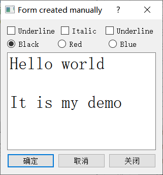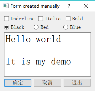 void QWDlgManual::iniUI() { //创建3个CheckBox:Underline,Italic,Bold,水平布局 chkBoxBold = new QCheckBox(tr("Underline")); chkBoxUnder = new QCheckBox(tr("Underline")); chkBoxItalic = new QCheckBox(tr("Italic")); QHBoxLayout * HLay1 = new QHBoxLayout; HLay1->addWidget(chkBoxUnder); HLay1->addWidget(chkBoxItalic); HLay1->addWidget(chkBoxBold); //创建3个RadioButton:Black,Red,Blue,水平布局 rBtnBlack = new QRadioButton(tr("Black")); rBtnBlack->setChecked(true); rBtnRed = new QRadioButton(tr("Red")); rBtnBlue = new QRadioButton(tr("Blue")); QHBoxLayout * HLay2 = new QHBoxLayout; HLay2 -> addWidget(rBtnBlack); HLay2 -> addWidget(rBtnRed); HLay2 -> addWidget(rBtnBlue); //创建确定、取消、退出3个PushButton,水平布局 btnOK = new QPushButton(tr("确定")); btnCancel = new QPushButton(tr("取消")); btnClose = new QPushButton(tr("退出")); QHBoxLayout * HLay3 = new QHBoxLayout; HLay3 -> addStretch(); HLay3 -> addWidget(btnOK); HLay3 -> addWidget(btnCancel); HLay3 -> addStretch(); HLay3 -> addWidget(btnClose); //创建文本框,设置初始字体 txtEdit = new QPlainTextEdit; txtEdit -> setPlainText("Hello world\n\nIt is my demo"); QFont font = txtEdit->font();//获取字体 font.setPointSize(20);//修改字体大小 txtEdit->setFont(font);//设置字体 //创建垂直布局,并设置为主布局 QVBoxLayout * VLay= new QVBoxLayout; VLay -> addLayout(HLay1); VLay -> addLayout(HLay2); VLay -> addWidget(txtEdit); VLay -> addLayout(HLay3); setLayout(VLay); }