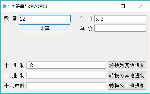 void Widget::on_btnCalc_clicked() { QString str = ui->editNum->text();//读取数量n int num = str.toInt(); str = ui->editPrice->text();//读取单价 float price = str.toFloat(); float total = num*price; str = str.sprintf("%.2f",total); ui->editTotal->setText(str); }