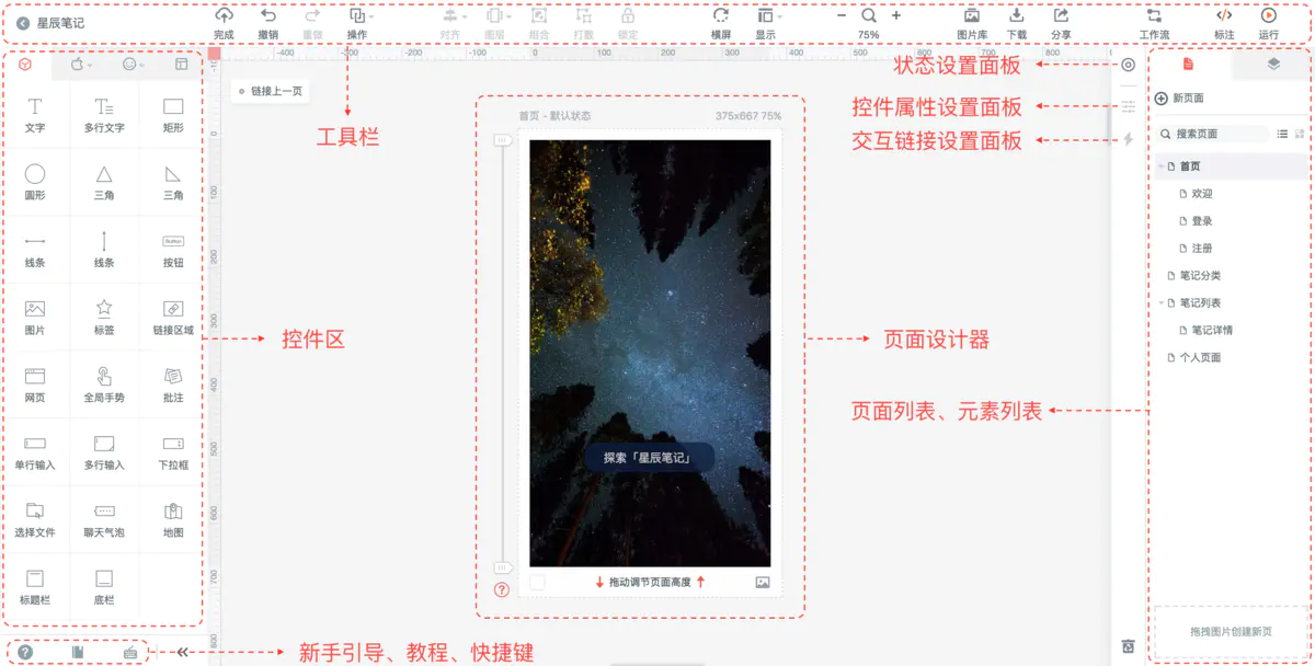 Axure作为老牌的原型图工具,功能最齐全,交互最多样,可以实现非常多条件判断、巧妙运用可以实现更复杂的交互,尤其在制作PC端原型图上有优势。设计区域是无限画布,方便给设计稿添加文字注解。