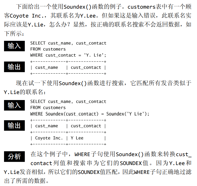 其中SOUNDEX函数需要特殊说明,SOUNDEX是一个将任何文本串转换为描述其语音表示的字母数字模式的算法,使得能对串进行发音比较而不是字母比较。