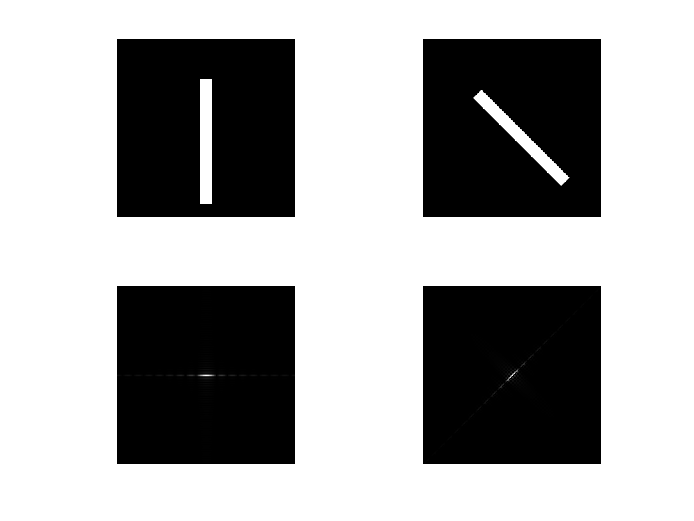 clear; clc; I=zeros(256,256);I(59:237,120:136)=1; J=imrotate(I,45,'bilinear','crop'); I1=fft2(I);F=abs(I1);I2=fftshift(F); J1=fft2(J);F=abs(J1);J2=fftshift(F); subplot(221);imshow(I); subplot(222);imshow(J); subplot(223);imshow(I2,[]); subplot(224);imshow(J2,[]);