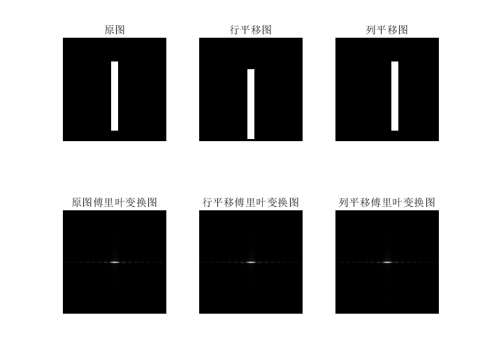 4.生成一副图像(简单的黑底白块,参考下面生成程序,但是需自己重新设定数值),进行离散傅里叶变换,再对其分别进行X轴与Y轴上的平移,并分别对其进行离散傅里叶变换,观察3副傅里叶变换图。需显示6幅图,原图,行平移图,列平移图,行平移傅里叶变换图(频谱中心化),列平移傅里叶变换图(频谱中心化)。