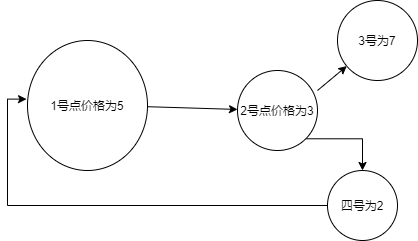 我们任取一点开始,比如从1开始,1号能直接到2号,用它的价格和2比较,2更小不更新,2更新3,3此时进价为3,2不更新4号.