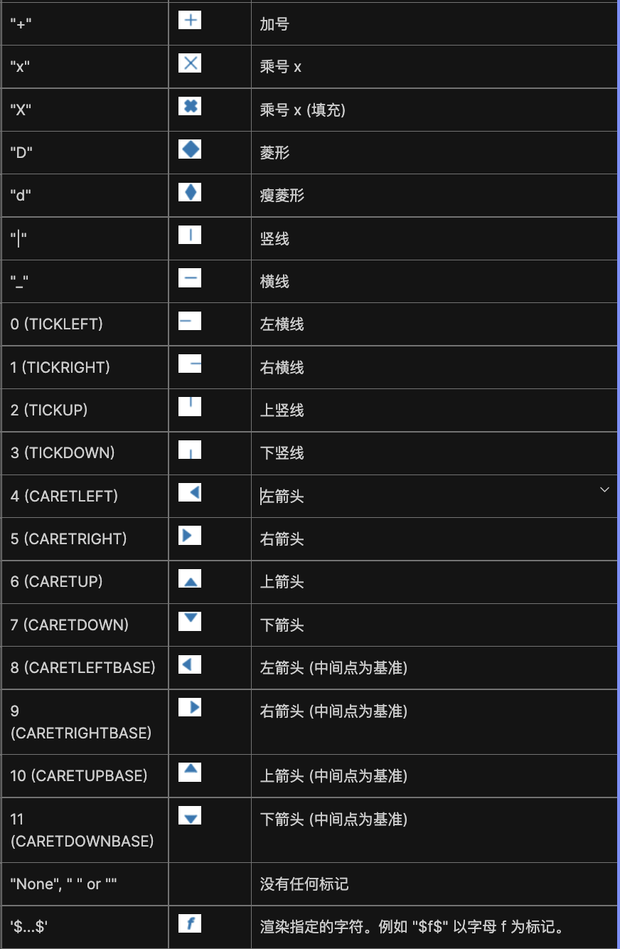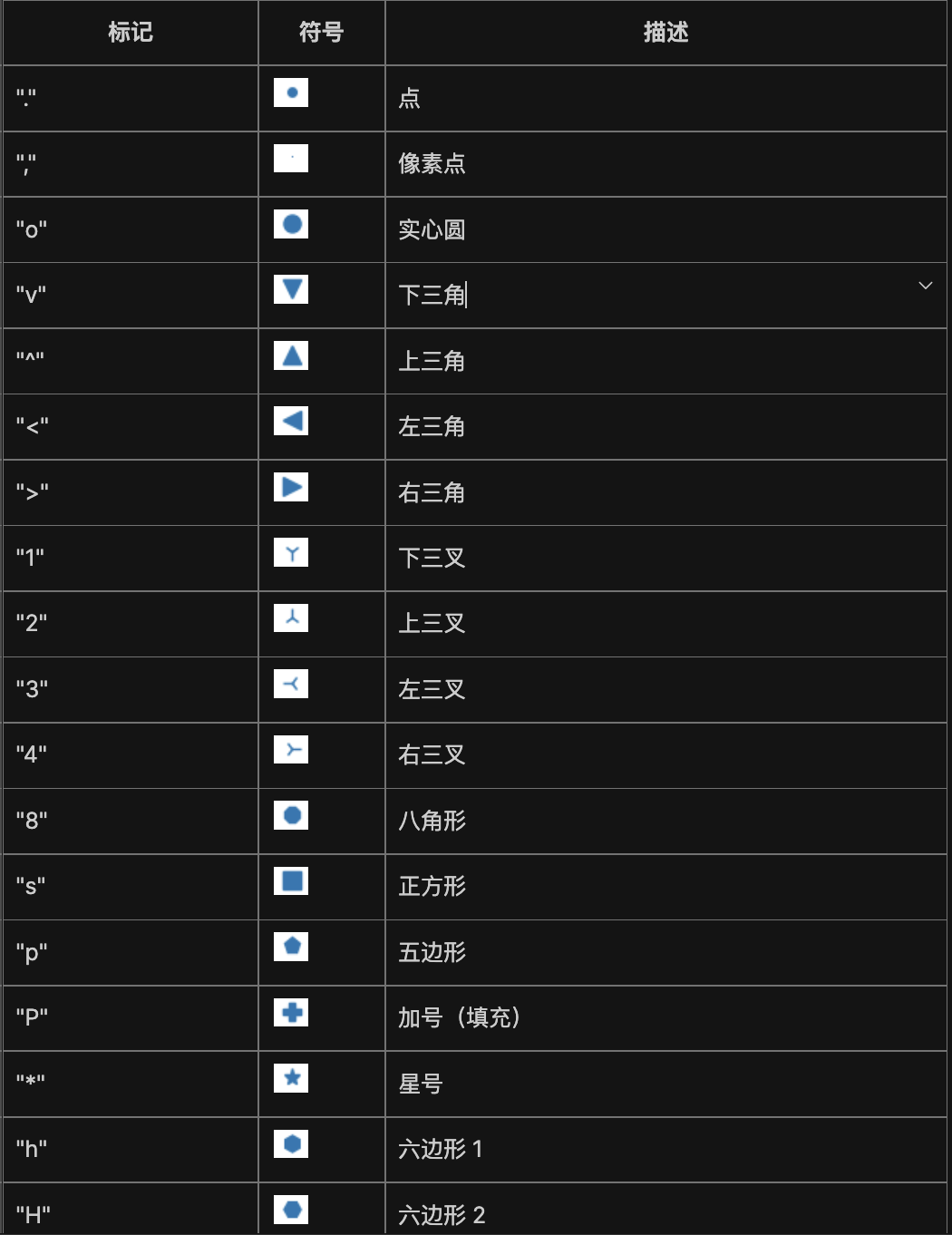 常用点标记 点 - '.' 像素 - ',' 圆 - 'o' 方形 - 's' 三角形 - '^' 更多点标记样式点击这里