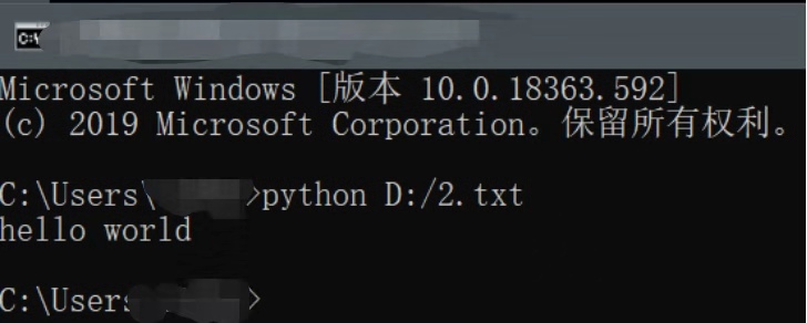 ----第二种,将写好的文件导入到Python解释器中:首先打开记事本,写入print('hello world'),将其保存至D盘的根目录下,命名为hello.txt,然后打开cmd,输入命令行:python hello.txt。