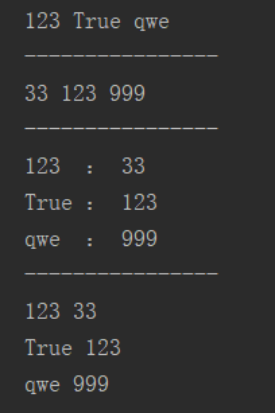 8 print(item, end=" ") # 输出结果为:123 True qwe