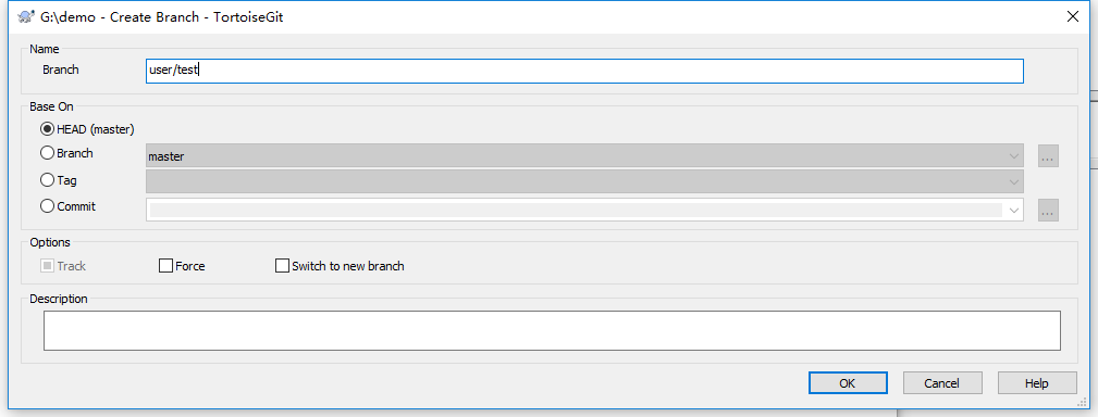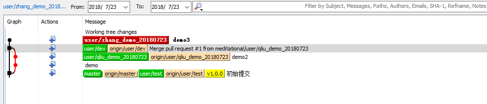 截至目前是只有一个开发者在操作,接下来在创建一个分支模拟两个操作者同时开发,(多个开发者类似,每个人有自己的分支),新建分支user/zhang_demo_20180723分支(红色):