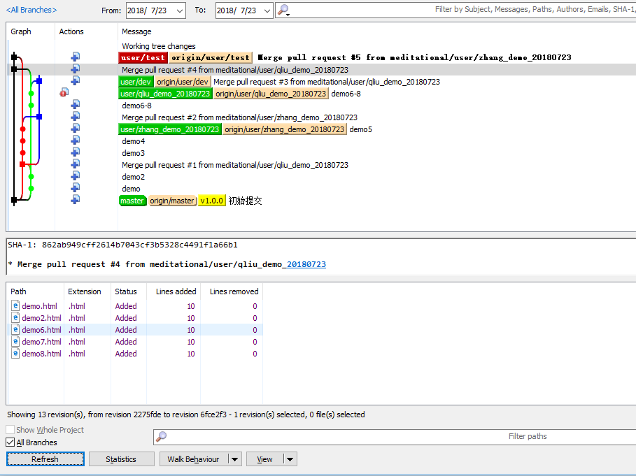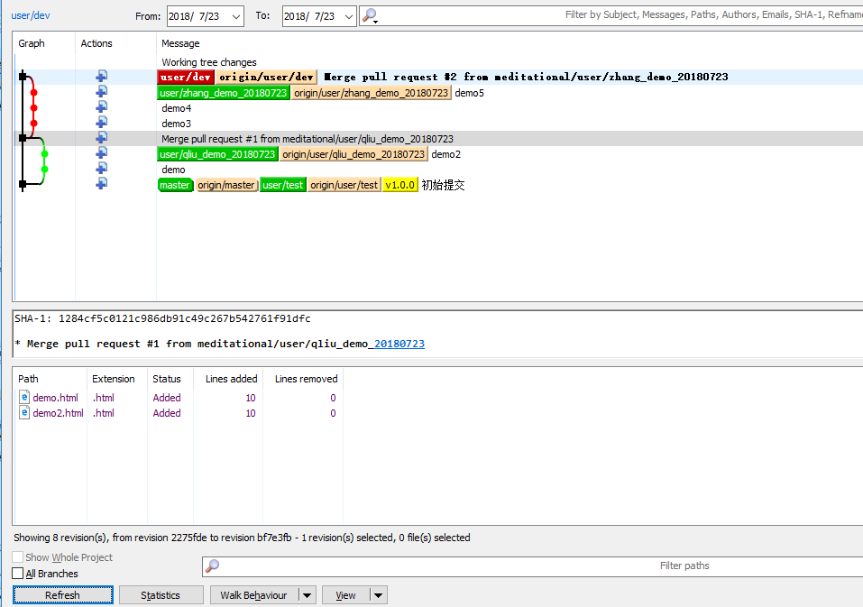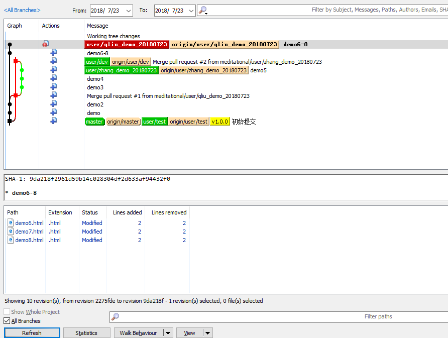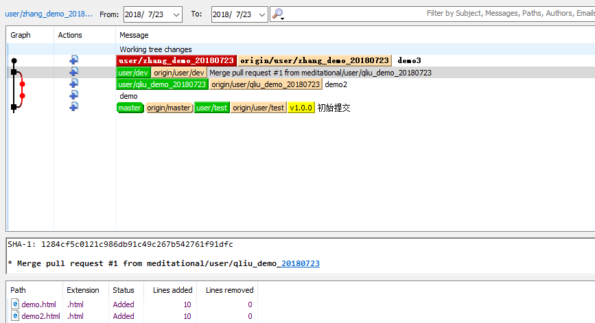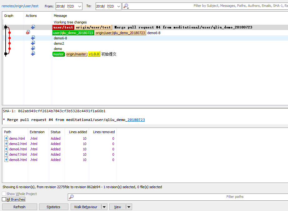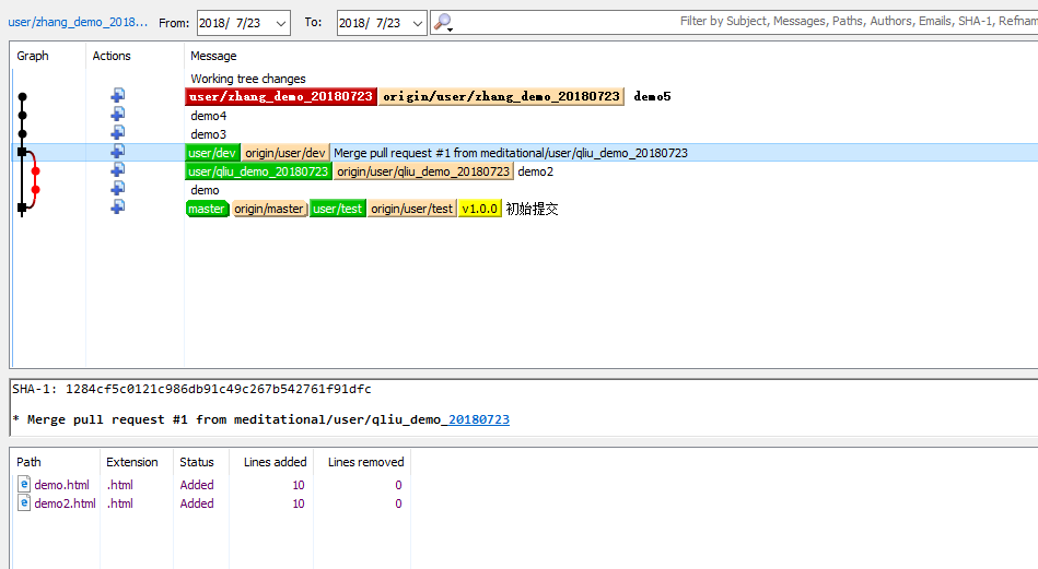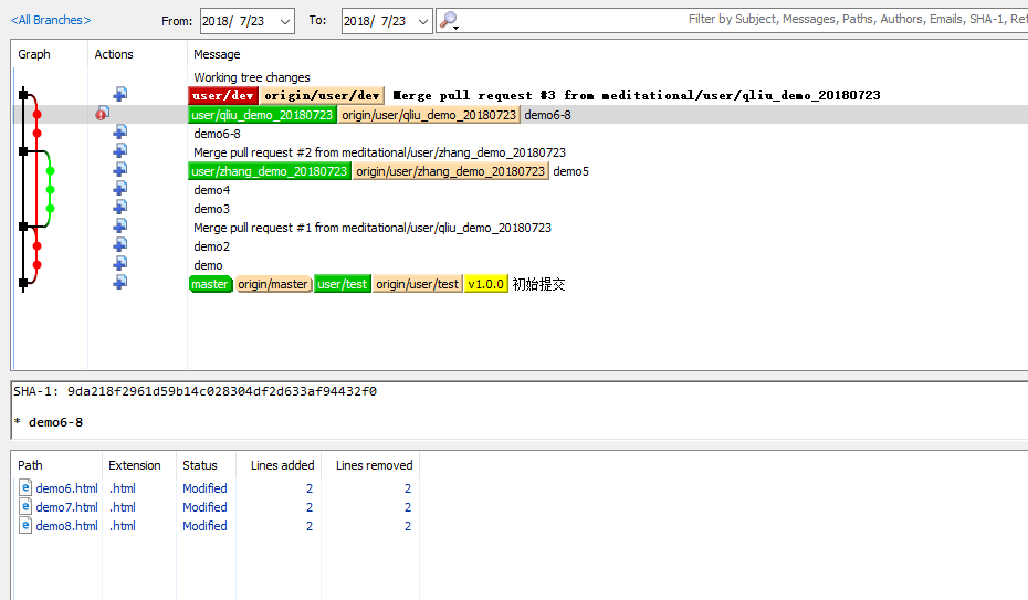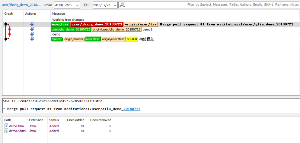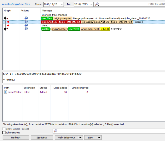 红色线条第一个节点,表示从蓝色分支(qliu_demo_20180723)pull代码,第二个节点表示从绿色节点(zhange_demo_20180723)pull代码