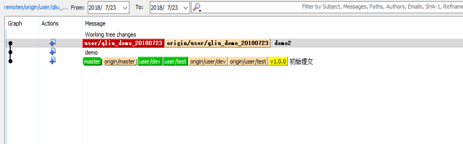 这时候分别切换到 master、dev、test、qliu_demo_20180723是个分支graph图如下: