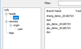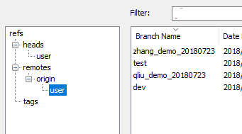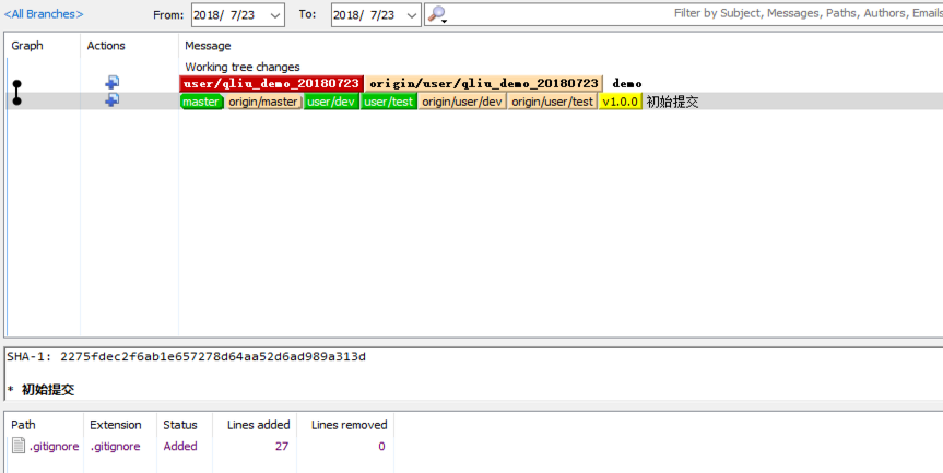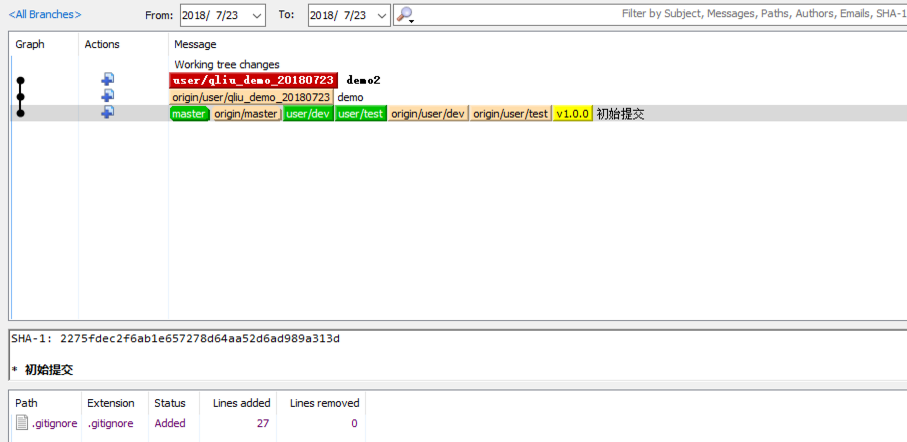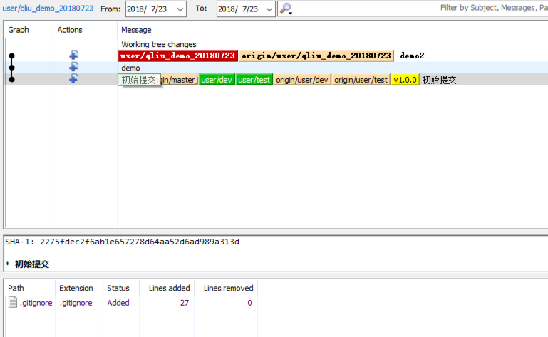 模拟实际开发分支commit代码的过程,这里主要是用主分支master,开发分支dev,测试分支test,本地分支qliu_demo_20180723,zhang_demo_20180723,