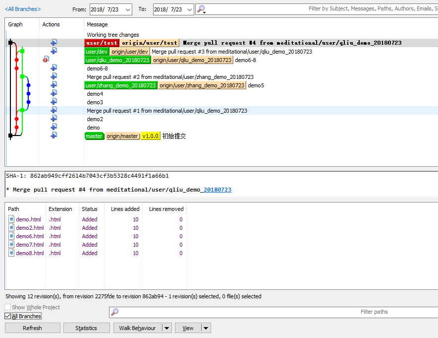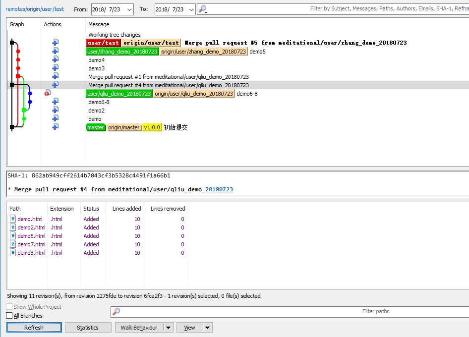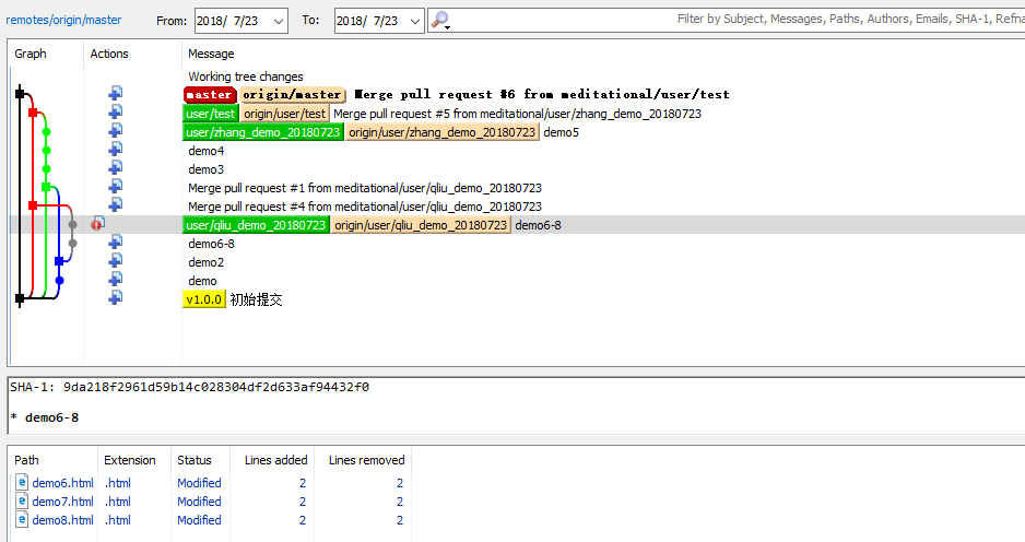 master分支:graph黑色表示当前分支master,红色表示test,绿色表示zhang_demo_20180723,蓝色表示qliu_demo_20180723,灰色的表示在蓝色分支上有两次commit和push,一次merger,