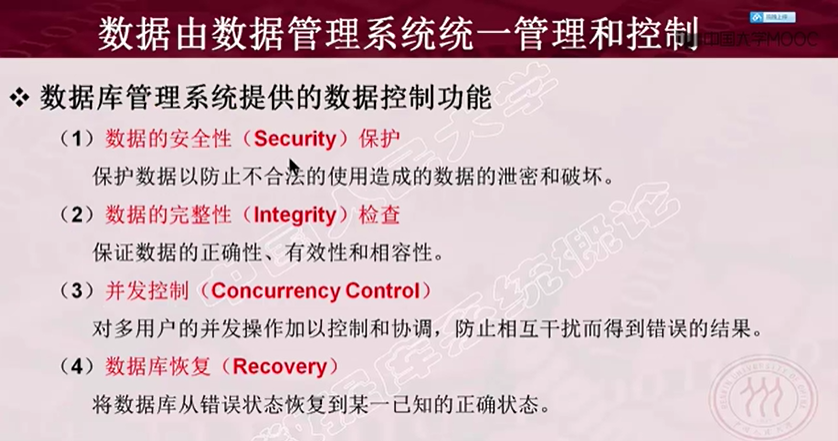 - 数据库管理系统在数据库建立、运用和维护时对数据库进行统一控制,以保证数据的完整性、安全性,并在多用户同时使用数据库时进行并发控制,在发生故障后对数据库进行恢复