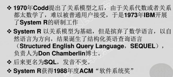 - 层次/网状数据库系统、关系数据库系统、新一代数据库系统