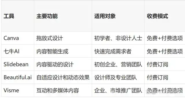 对于简单报告和教学内容:Canva和七牛AI能够快速提供结果,适合非专业设计师。