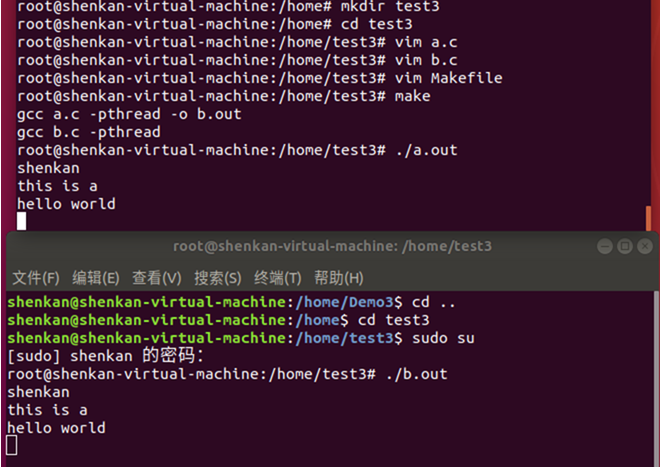 打开另一个终端窗口。分别键入命令:./a.out和./b.out