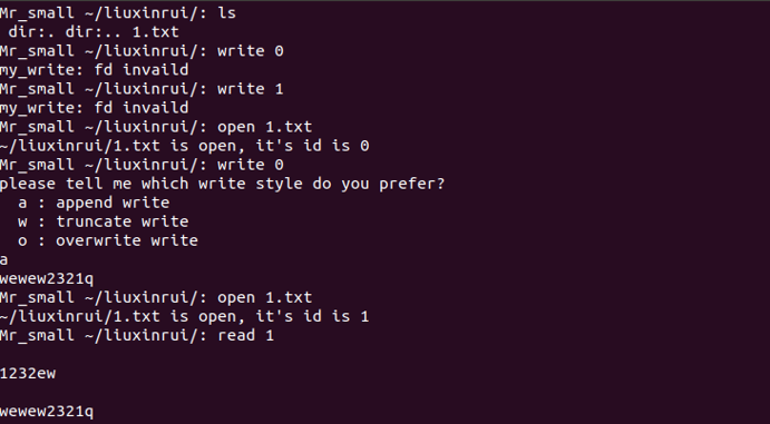 在自己的文件系统里创建一个liuxinrui文件夹,并在这个文件夹里创建一个名为1.txt的txt文本,运用“write”命令写入文本后再使用“read”命令对1.txt文本的内容进行读取。