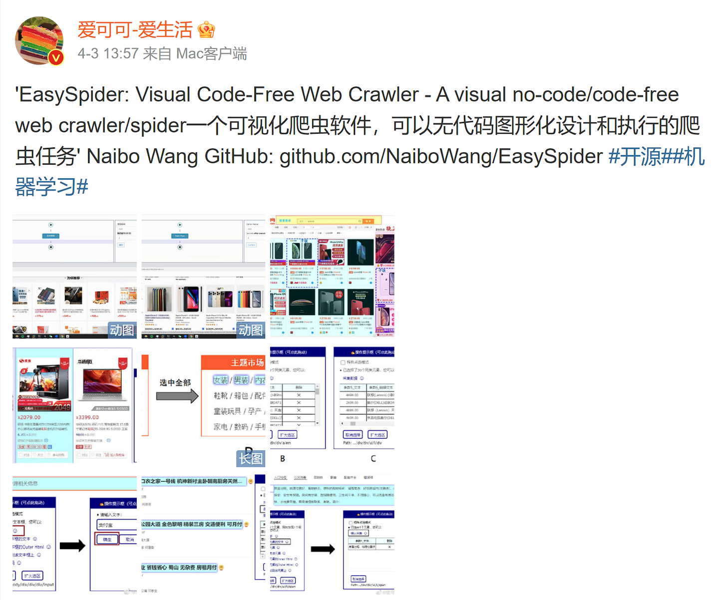 4、 被微博81.6万粉丝互联网大V“爱可可-爱生活”转发和宣传: https://s.weibo.com/weibo?q=easyspider