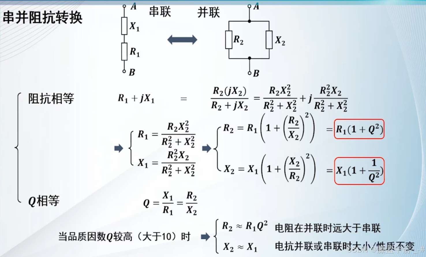 - 对于串联形式的Q,就是电抗X1除以电阻R1;对于并联形式的Q,由于是并联的电阻Rp的形式,所以就是电阻R2(Rp)除以电抗X2。