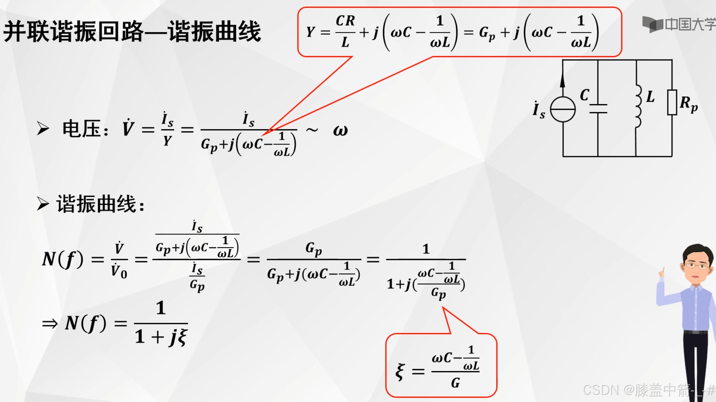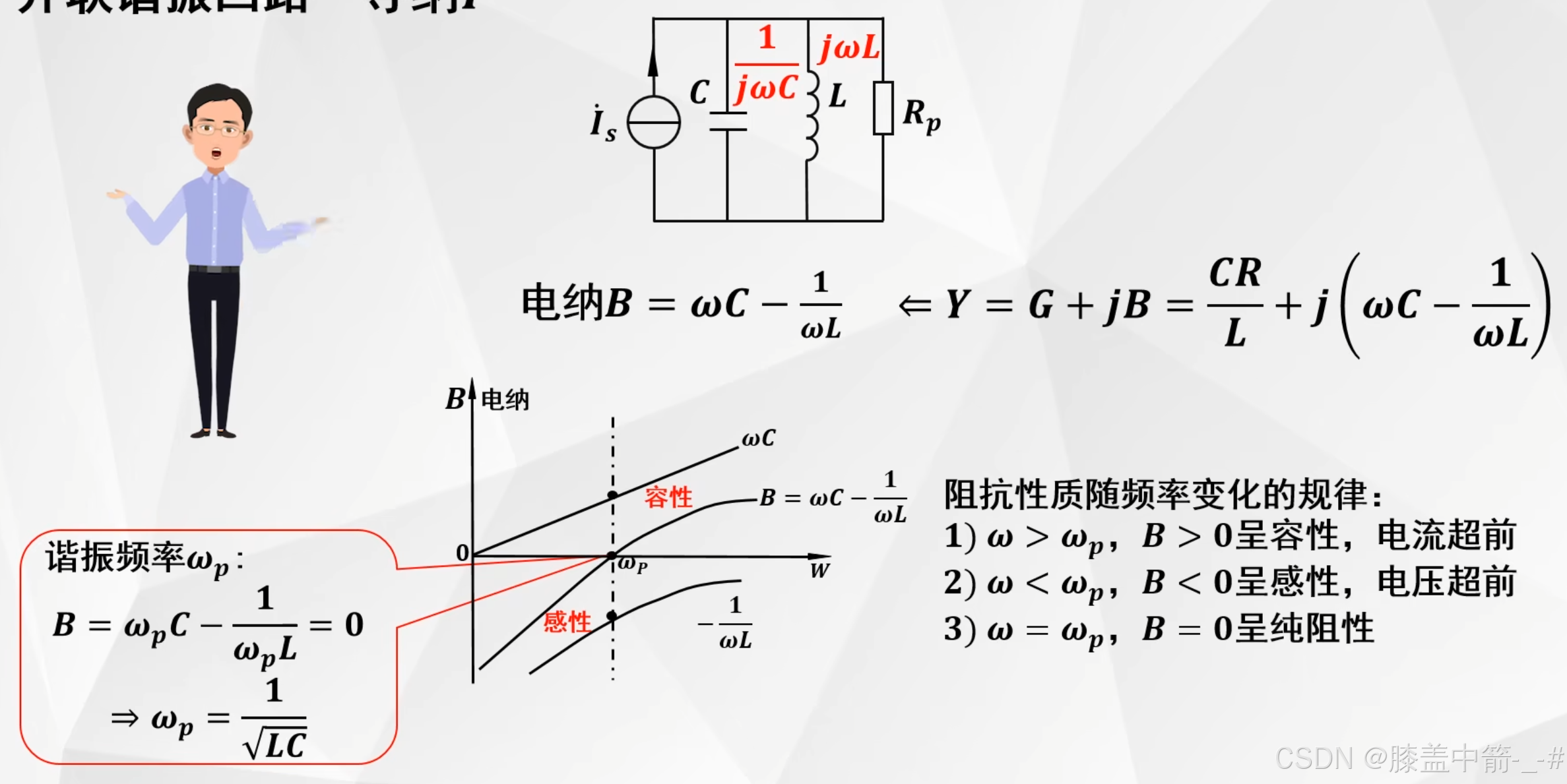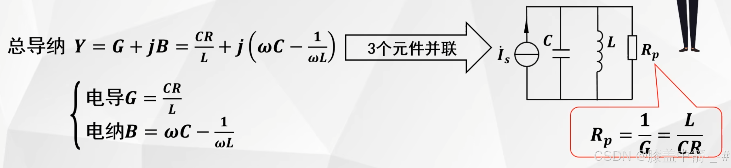 - 总导纳又相当于三部分相加:电阻、电容和电感。着三部分都呈现出电导或者电纳的形式,它们加在一起,实际上就意味着三个元件并联,根据导纳的式子,就可以画出,C、L和Rp的一个并联回路。