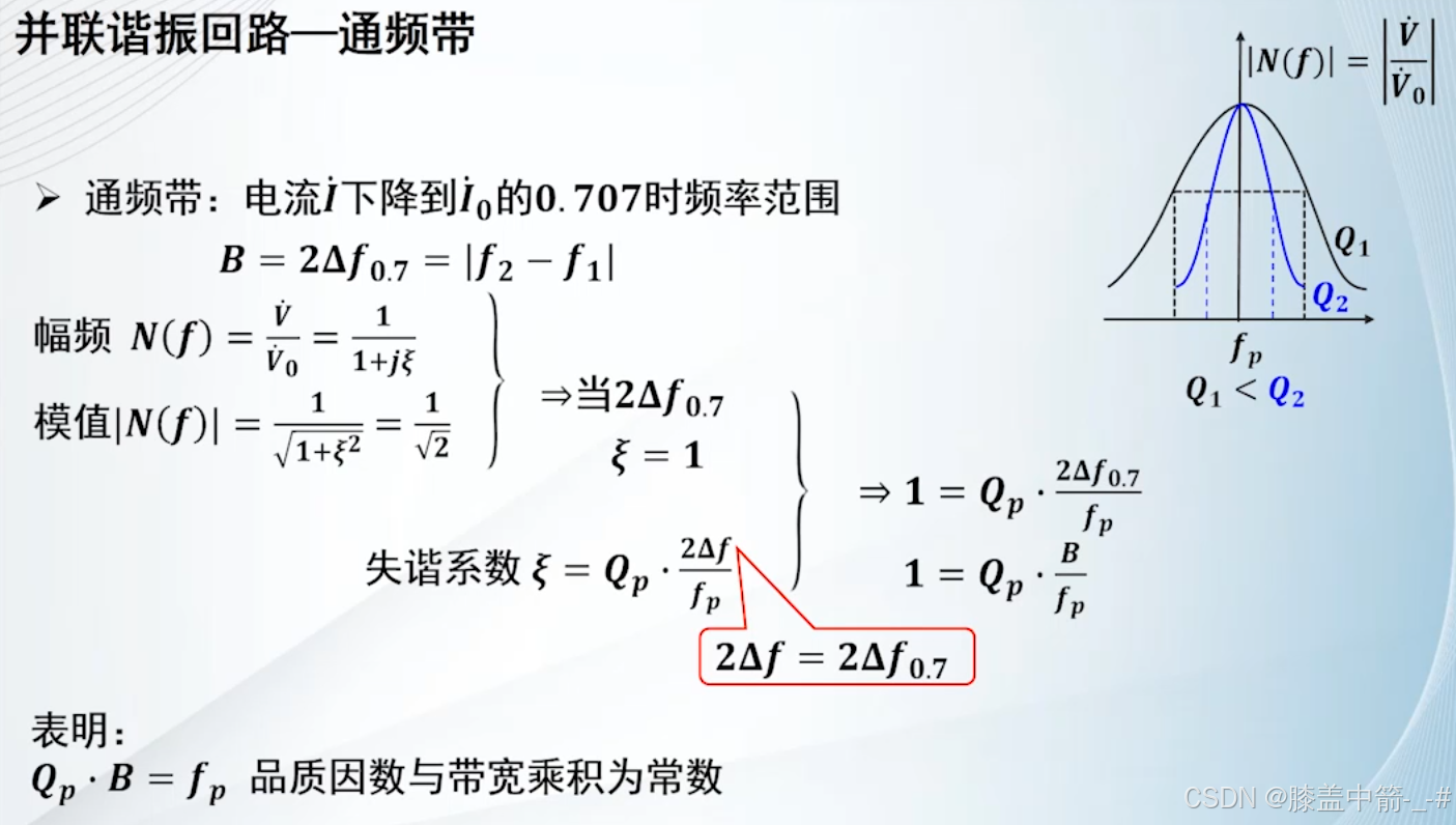 - 幅度下降到0.707的时候,代入到幅频特性曲线中,就可以求出此时的失谐系数等于正负1,此时频率的偏移,正好就等于0.707的频率偏移。失谐系数公式中,Δf的频偏就等于0.707的频偏,也就是带宽。