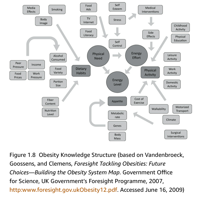 作为外行的一般人,你可能认为解决肥胖危机很简单,就是少吃,多运动。对吗?并不是这么简单。下图摘自于研究人员Scott Page的一本书Diversity Bonus,仅仅部分展示了肥胖流行病是有多么地复杂。我们可以看到,要解决这个问题其实需要许多不同领域的结合努力:生理学、遗传学、行为心理学、社会学、经济学、市场营销学、普通心理学、教育系统、营养学。
