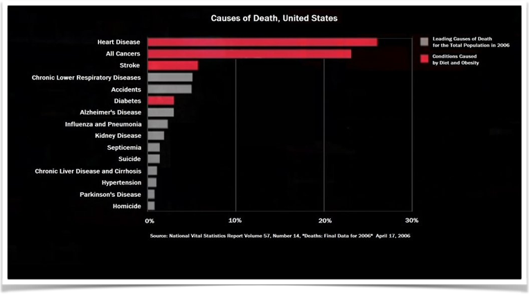 我们就以肥胖症为例。如下图所示,饮食不合理和肥胖占据了美国人15大致死原因中的4个。这些数百万的死亡其实是完全可以避免的。