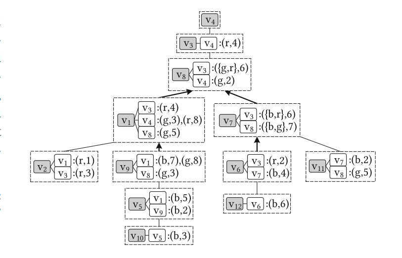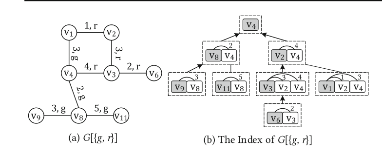 一种朴素的做法是,假如我们考虑没有标签的两点之间最短路问题,可以用图的树分解,将图分解成一棵树,树上每一个节点是图上一组点的集合,比如说树节点X(1)={2,3,4},在这个树节点中,包含图上1,2,3,4节点的信息,也包含1到2,3,4的最短路。根据树分解的性质,对于每组查询(u,v),可以查询u,v到LCA节点的最短路,找到其中最短的一条路径即为答案。