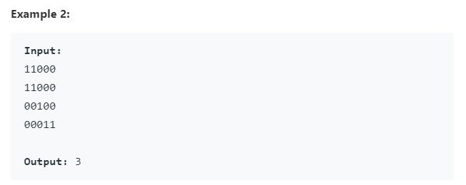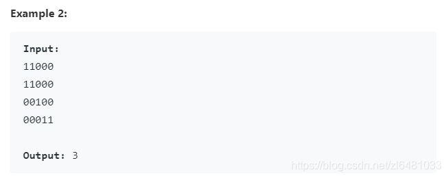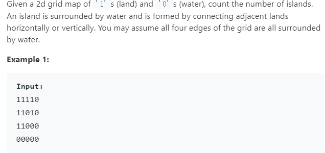 这道题求岛屿数量,岛屿是周围都是水,二维数组中1为岛屿,0为水,并且连着的岛屿算一个。求给定的数组中岛屿的数量。我们可以遍历,在找到一个岛屿的时候,计数加1,把它设为0,对其进行深搜,找其周围是否还存在岛屿,如果存在也将其设置为0,然后再找其余的1进行遍历。