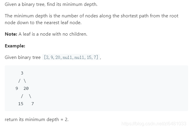 求树的最小深度,递归求出左右子树,返回其中小的那个。需要注意的是这里的叶子节点指的是两个子节点都为空的节点,如果只是其中一个子节点为空那么需要返回的是另一个的高。