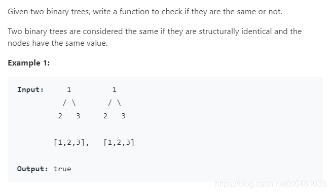 这道题算比较简单,判断两个树是否相同,只需要递归左右子树即可。在递归开始进行边界的一些判断。