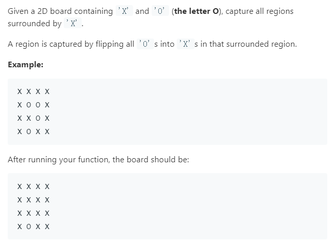 本来以为只要把不是边界的O变为X就好,很明显不会那么简单,如果边界上的O相连的非边界的也是O那么这个O也不能变成X。这道题找被包围起来的O比较难找,那就找所有没有被包围起来的O,然后再找所有和边界上的O相邻的非边界O,先将这些O变成#,之后再将所有的O变为X,将所有的#变成O。而其中这个找的过程用的是DFS。