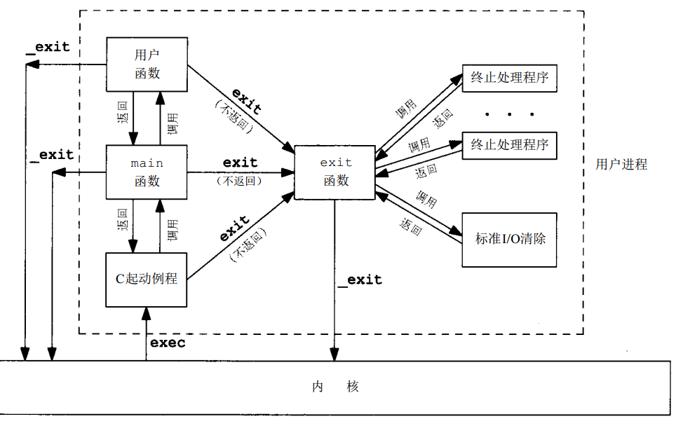 上图显示了一个C程序是如何启动的,以及各种终止方式。内核使程序执行的唯一方式是调用一个exec函数,进程自愿终止的唯一方式是显式或隐式的调用_exit,进程也可以非自愿的由一个信号使其终止。