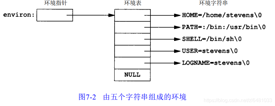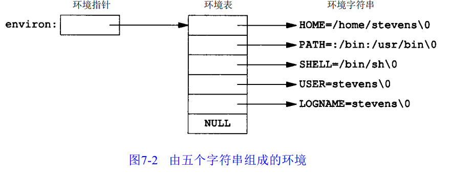 每个程序都接收到一个环境表,与参数表一样,环境表也是一个字符指针数组,其中每个指针都包含一个以null结束的字符串的地址,全局变量environ则包含了该指针数组的地址,如下图,该环境包含五个字符串,