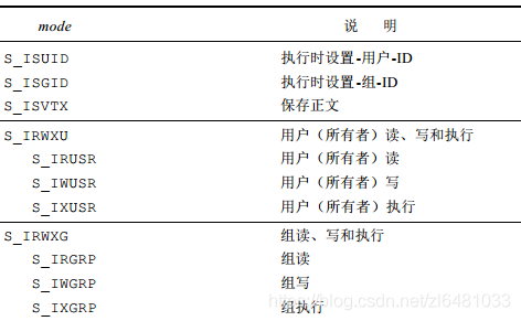 st_mode中也包含了对文件的存取许可权,前面提到的文件类型都有其存取许可权。每个文件有9个存取许可位,因为在linux中一个文件的权限分为三个组,文件属主权限、文件属组权限、其他用户权限,而每个组又有三个权限:分别是读取(r)写入(w)和执行(x)所以使用ls -l时可以得到文件的权限标志。系统也提供了宏方便我们从st_mode中取得相应的权限位。