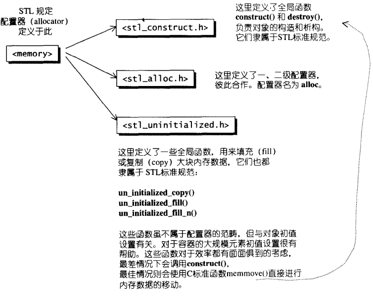 对象构造前的空间配置和对象析构后的空间释放,都由alloc.h负责,SGI对空间配置器的设计哲如下:1)向系统堆要求空间。2)考虑多线程的状态。3)考虑内存不足时的应变措施。4)考虑过多小型区块可能造成的内存碎片问题。C++的内存基本操作是::operator new(),释放内存的基本操作是::operator delete()。其实在在他们的内部还是使用C语言中的malloc和free实现的。小型区块的内存破碎问题原因如下: