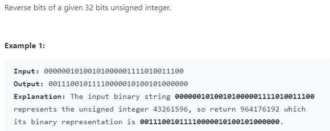 这道题还是一道和二进制、位操作有关的题,将一个数的二进制颠倒。很容易想到的就是,从最后一位开始取,如果为1则先左移1位然后加1,如果为0,则只左移1位。然后再将原来的数右移一位去掉我们已经取过的位。