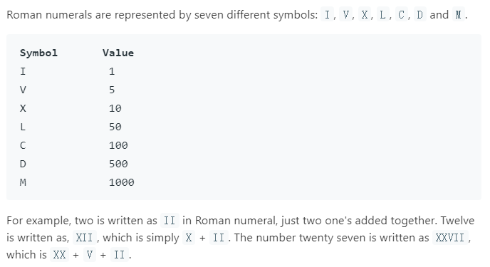 输入一个字符串,这个字符串是一个罗马数字,将这个罗马数字转为阿拉伯数字。首先罗马数字的字符一共只有那么几个,每一个字符代表一个数字,这样的话就需要判断每一个字符,需要知道对于出现的每一个字符代表的数字是应该加还是减。可以根据罗马数字的规律,会发现,如果后面的字符代表的数字小于等于前面的数字的话应该是加。相反的话,则是减。这样的话,遍历每一个字符,然后计算则可得出结果。