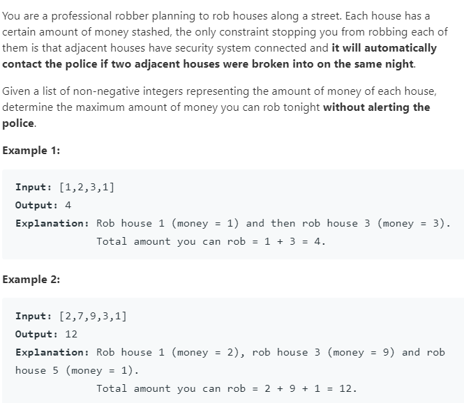 题目意思是给一个数组,从其中提取一系列数据,这些数据任意两个数据不能相邻,让这些数据的和为最大值。一开始理解错题意,以为只要将奇数和偶数的位置上的数字加起来再比较就可以了,但是这样会有一种数组解答错误,比如[4,1,1,4]这样其实最大值是8,但是上面那样计算得到的值5。一般这种求最优值的题目,使用动态规划,动态规划使用一个dp[i]数组来保存到i位置的最大和。假设数组为[2,7,9,3,1],那么很明显dp[0]=2,dp[1]有两种情况,如果nums[1]>nums[0],则dp[1]=nums[1],如果小于的话,dp[1]=nums[0]。dp[2]有两种情况,一个是前面nums[0]+nums[2],一个是dp[1],两个哪个大就选择哪个。所以可以推导出来状态方程是dp[i]=max(dp[i-2]+d[i],dp[i-1])。具体代码如下代码。还有一种方法,核心方法其实还是dp,维护两个变量,对数组进行一次遍历,每遍历一个数字对前面的奇偶位置的和进行判断,更新起点。这个奇偶不是一开始的奇偶,而是每一次更新之后的相对的奇偶。