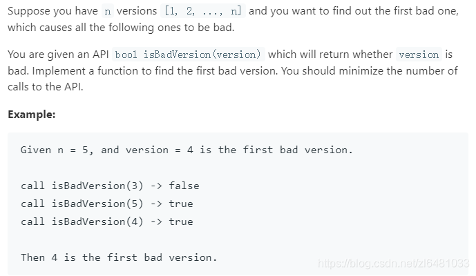 题意是尽少调用给出的判断函数,找到第一个出错的版本号。也就是从1到n中找到第一个使给出的判断函数的第一个返回为true的值。首先想到的应该是二分查找,如果返回为true说明第一次出错在左半部分,如果返回为right说明出错在右半部分,然后根据判断情况更改中间结点的值。