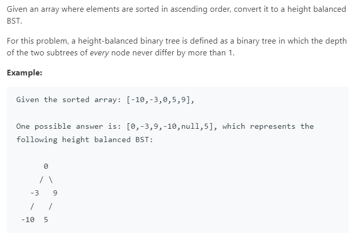 题目的含义就是将一个从小到大排序的数组变成一个二叉搜索树。二叉搜索树的中序遍历的结果其实就是一个从小到大的排序数组。所以我们反过来思考,首先将数组中间的值作为根节点,之后将数组分为两部分,左半部分插入左子树,右半部分插入右子树,通过递归实现。